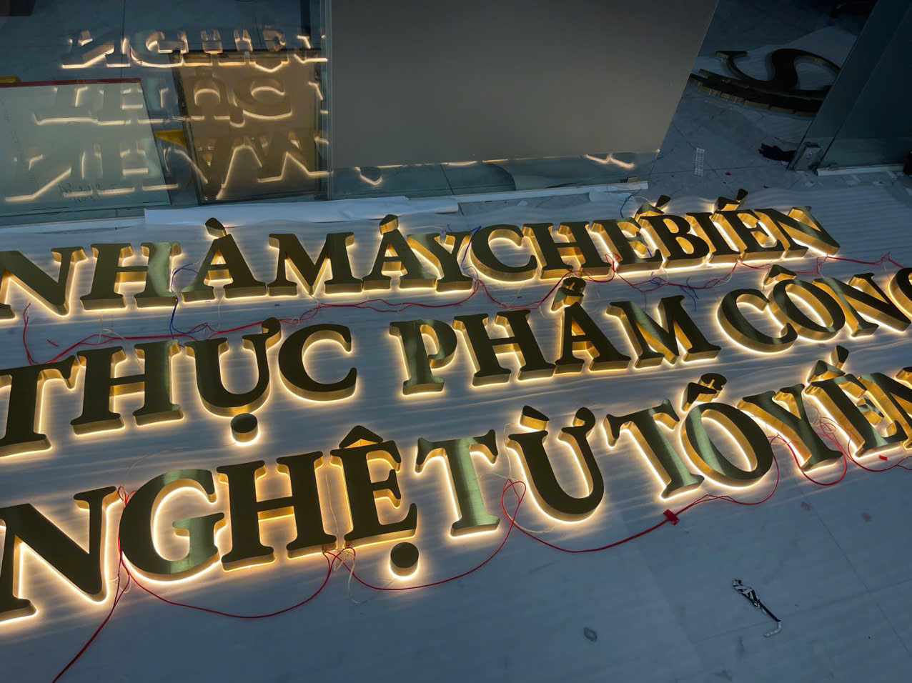 Sau khi lắp đặt xong, toàn bộ chữ nổi được kiểm tra ở nhiều góc nhìn khác nhau. Form chữ cần thẳng, chân chữ phải bám sát nền và ánh sáng hắt chân phải đều dọc theo viền chữ. Nếu phát hiện khu vực sáng không đồng nhất, thợ sẽ điều chỉnh lại vị trí LED để đạt hiệu ứng mềm và mượt đặc trưng của chữ nổi inox vàng xước. Việc kiểm tra kỹ ở bước cuối giúp bảng hiệu vận hành ổn định, giữ được vẻ đẹp ban đầu ngay cả khi sử dụng ngoài trời thời gian dài.