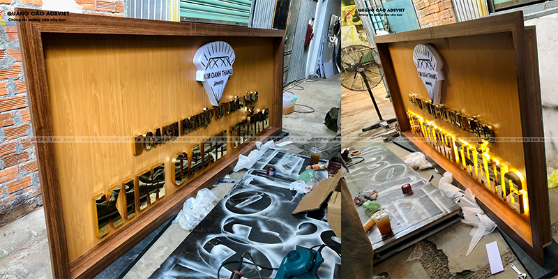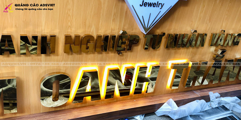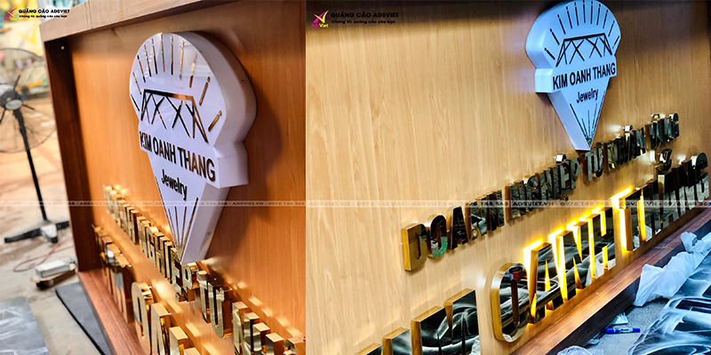 AdsViet xin giới thiệu mẫu chữ nổi inox sáng chân hở tường gắn vách gỗ quầy lễ tân cho tiệm vàng Kim Oanh Thắng, với chất liệu inox 304 sáng bóng, sang trọng, đặc biệt độ bền cao, khả năng chống ăn mòn giúp chữ nổi inox duy trì vẻ đẹp qua thời gian, phù hợp lắp đặt được trong nhà và ngoài trời