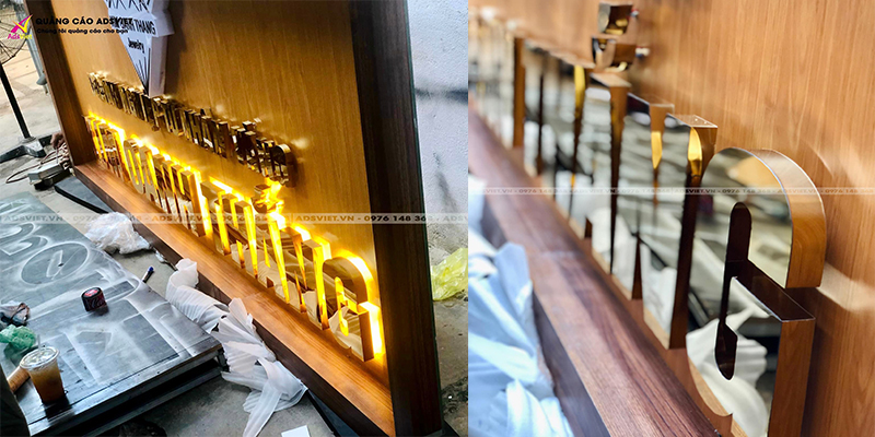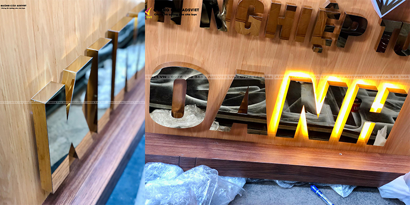 Điểm thu hút của mẫu chữ inox này là bên trong mỗi ký tự inox, lắp đặt đèn LED để tạo ra hiệu ứng ánh sáng chân hở. Các đèn LED có thể được đặt theo dạng dải hoặc các bóng riêng lẻ. Màu sắc và độ sáng của ánh sáng chân hở cần được phối hợp hài hòa với màu sắc của inox và môi trường xung quanh.